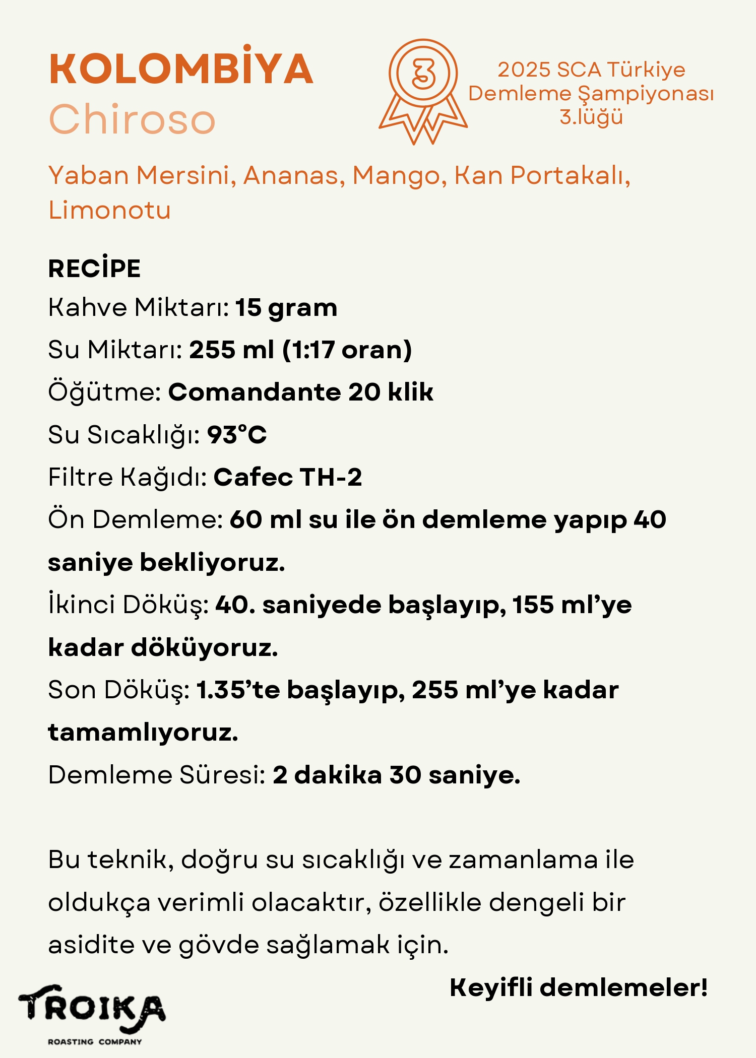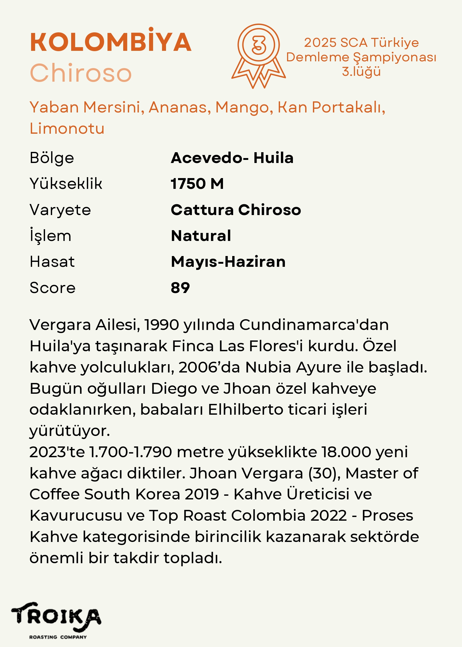 Chiroso hem çekirdek şekli hem de fincan profiliyle oldukça ender rastlanan bir varyete. Şeklen ince uzun yapısı ve fincan profili açısından da kompleks ve yüksek çiçeksilik ve tatlılığa sahip olması Chiroso’yu diğer varyetelerden ayırıyor. Üreticisinin tabiriyle, Chiroso’yu Kolombiya’nın yerel Gesha varyetesi olarak anabiliriz.