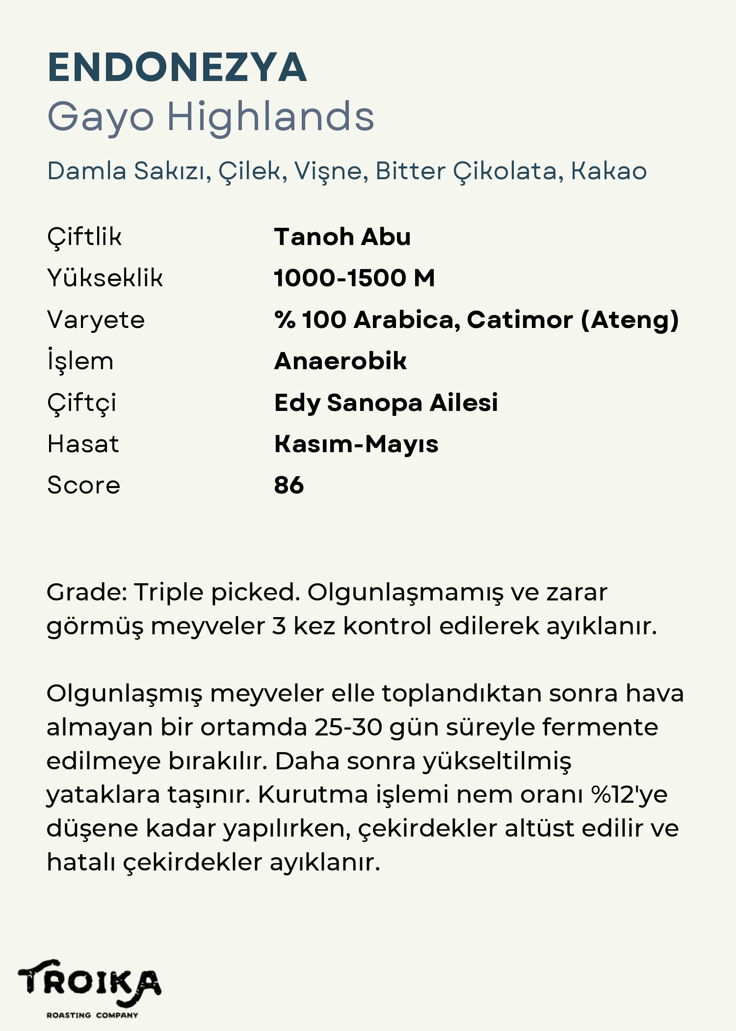 Grade: Triple picked, Olgunlaşmamış ve zarar görmüş meyveler 3 kez